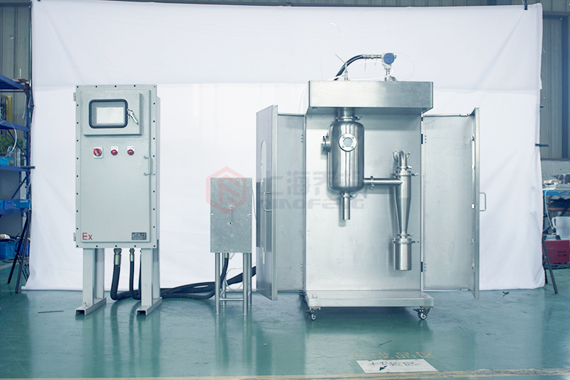 制藥專用 防爆級(jí)小型閉式噴霧干燥機(jī),裝置特別針對(duì)于有機(jī)溶劑,以使用循環(huán)氮?dú)舛纬傻亩栊詺怏w介質(zhì)取代通常的空氣介質(zhì),來進(jìn)行噴霧干燥。除了能回收產(chǎn)品之外,尚可回收有機(jī)溶劑。針對(duì)有機(jī)溶劑低閃點(diǎn)或者微毒的特點(diǎn),易燃易爆的特點(diǎn)特別設(shè)計(jì)該套閉式循環(huán)噴霧系統(tǒng)。